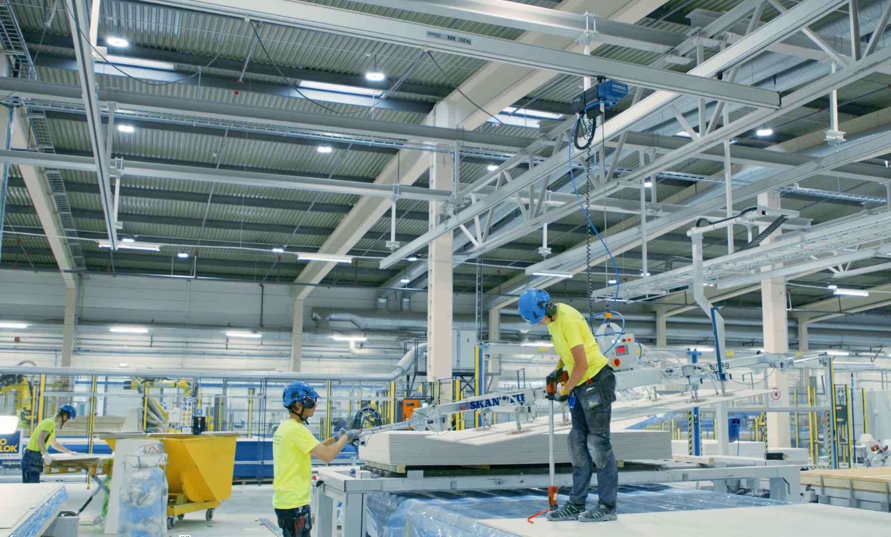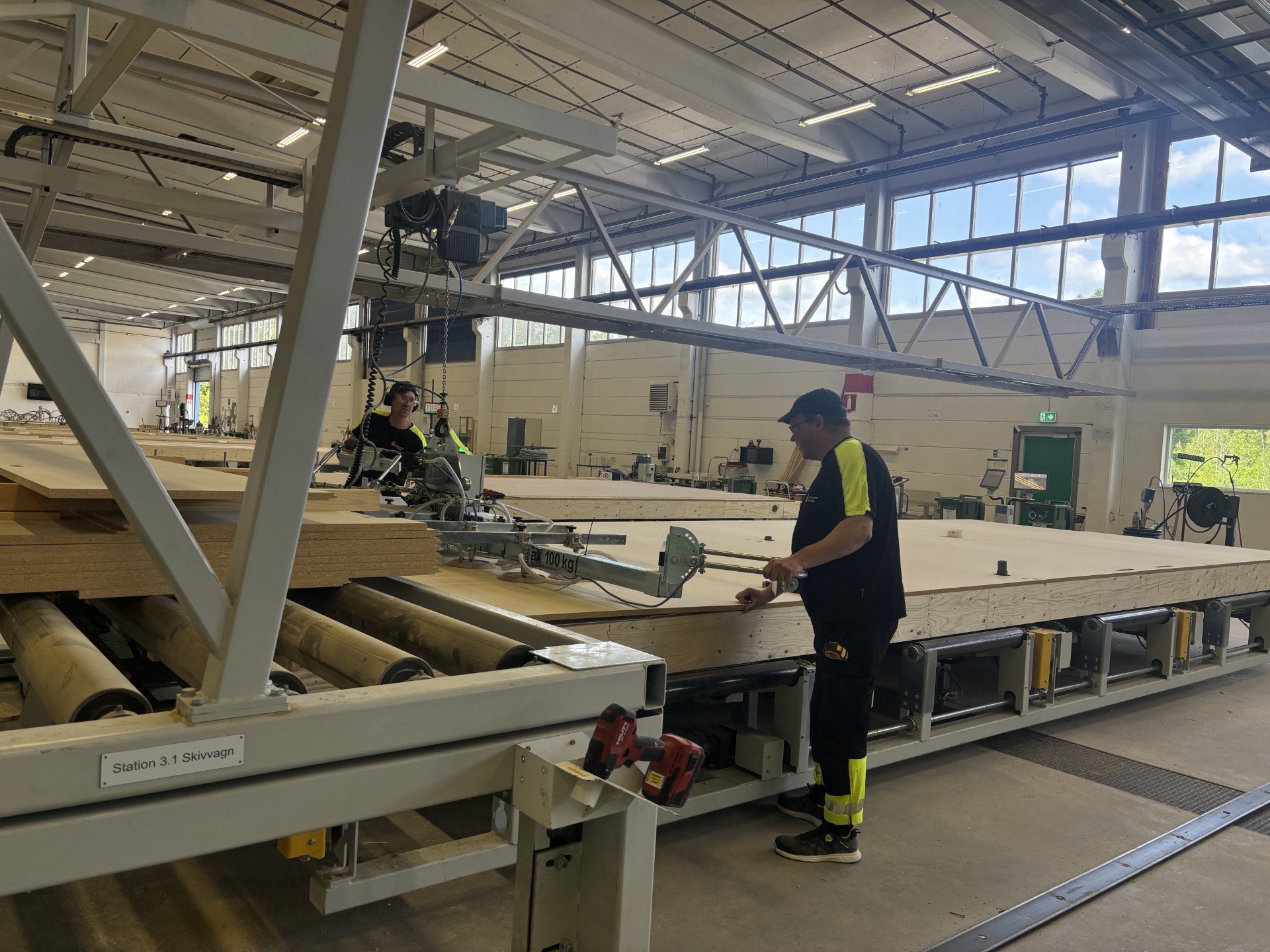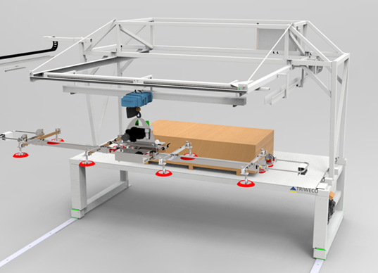 Material stacks are loaded onto the sheathing gantry from behind using a forklift. The vacuum gripper lifts one piece at a time, and operators position each sheet accurately onto the panel. Safety features include a double-release function to protect operators from accidental drops. The sheathing gantry is powered and travels along the panel as the work progresses and can be used with either our working table or your existing setup. The vacuum gripper itself is supplied by Triweco and manufactured by a trusted third-party brand, while the remaining parts of the product are manufactured by Triweco.