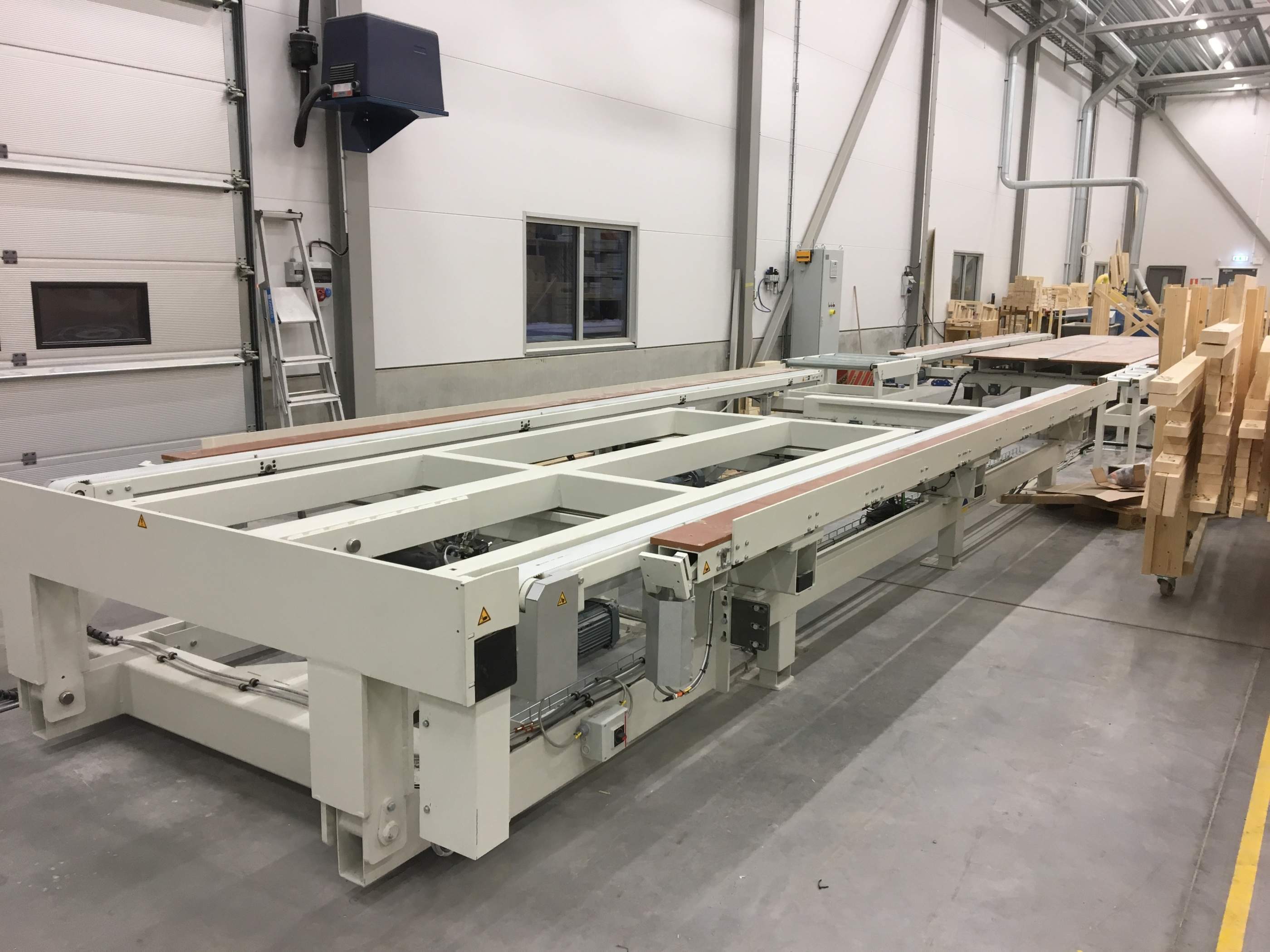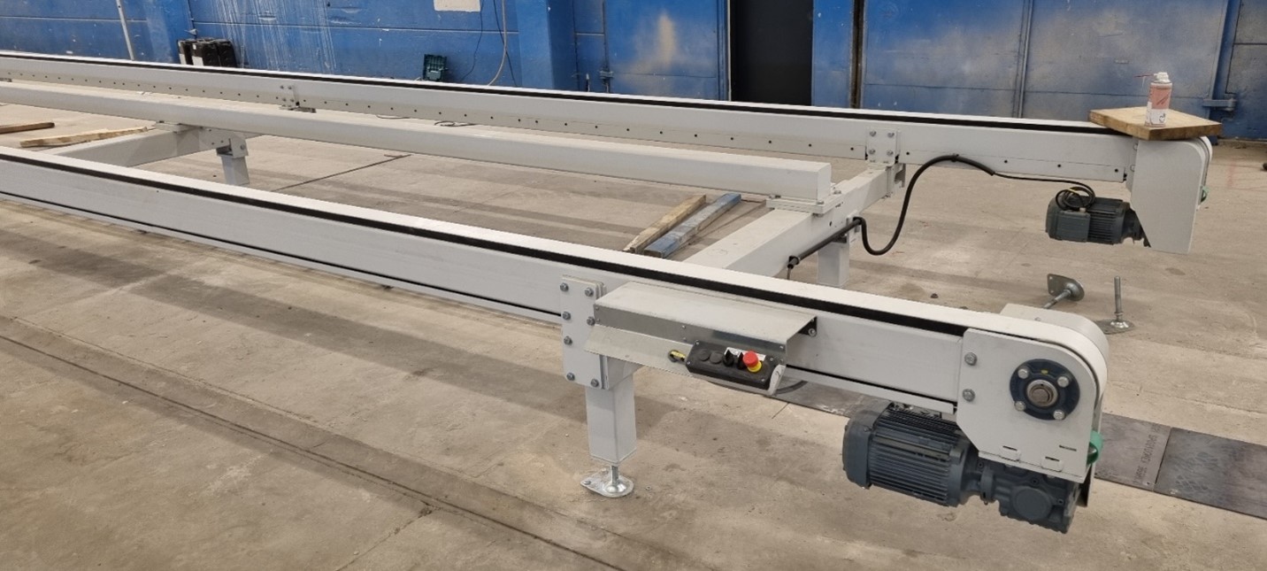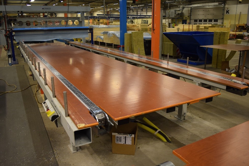 Developed to meet the demands of production facilities where panels need to be transported sideways, the sideways transport working table provides flexibility without compromising functionality. The table consists of electrically driven chain conveyors, pneumatic stops on the long side to place the element at the correct position, and a clamping unit to clamp the element against the stops. The station can be movable on floor rails to pick up elements from stations within the production line.